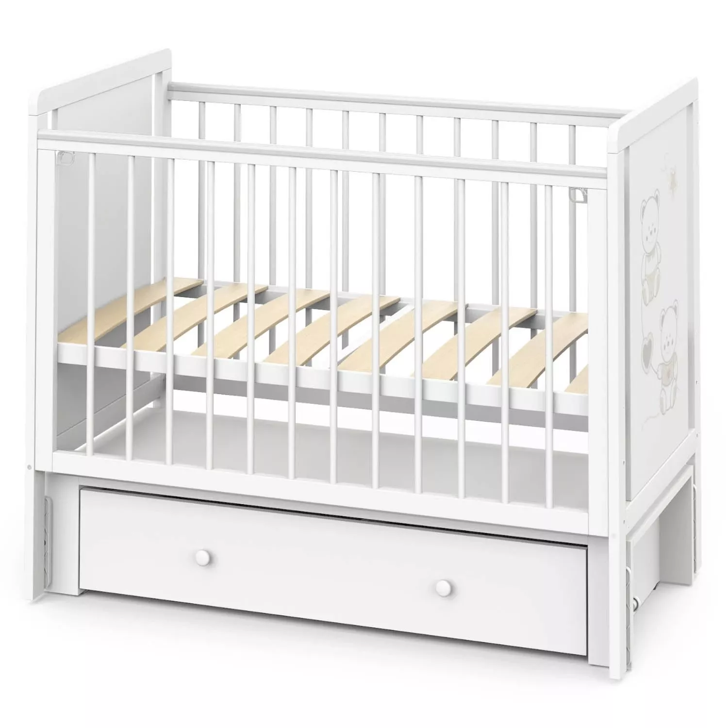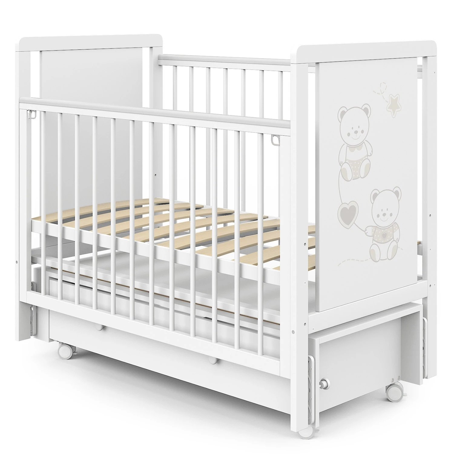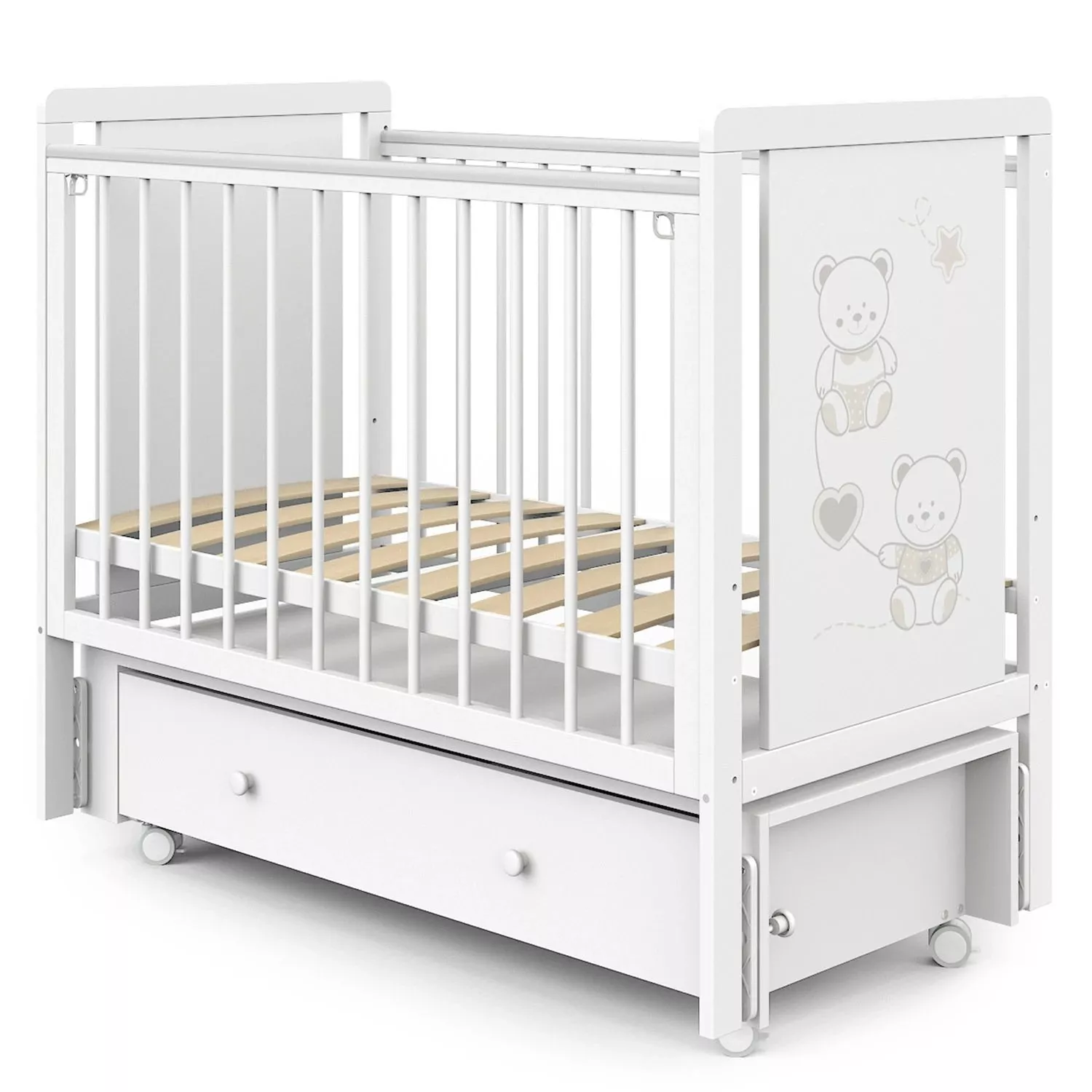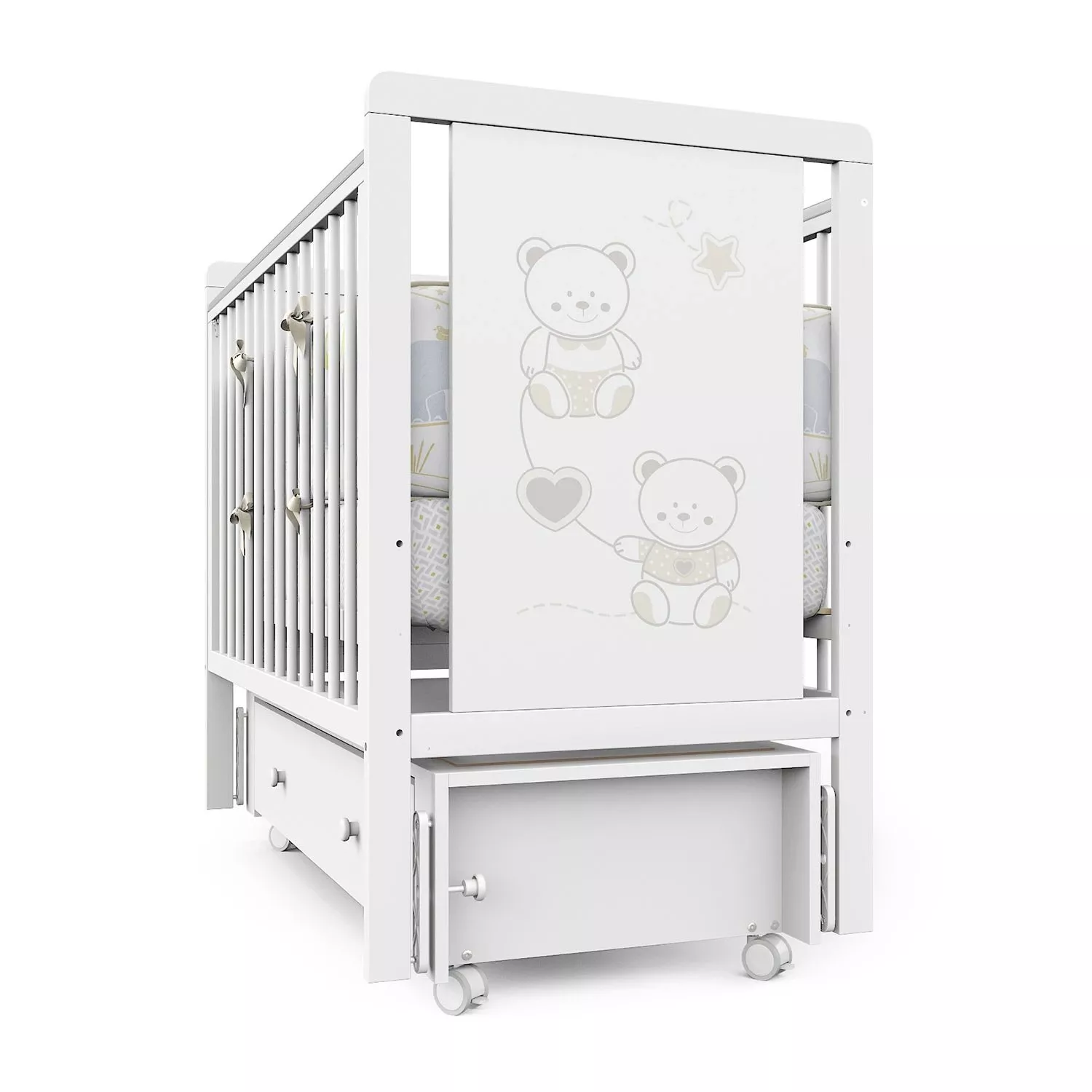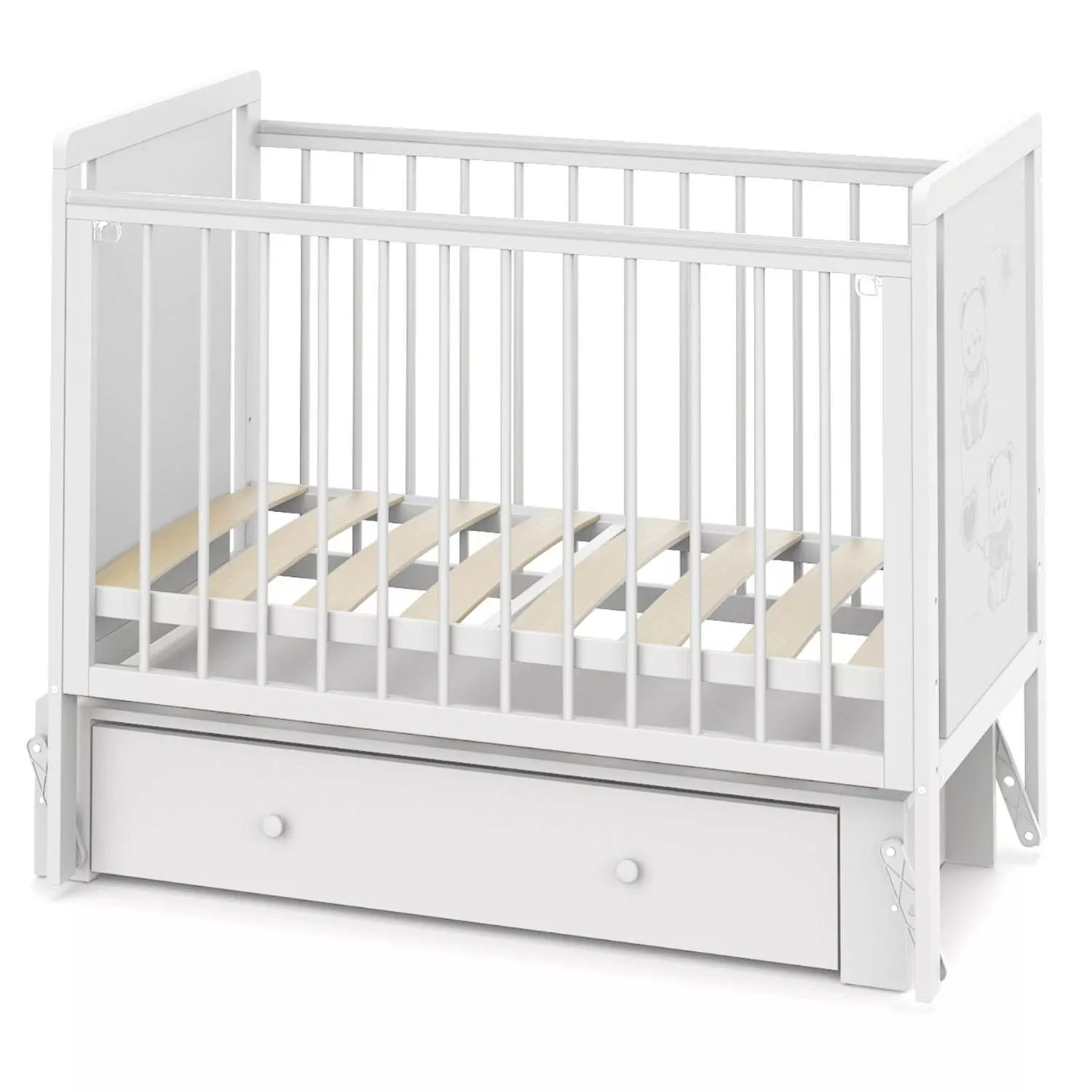 Кроватка Indigo "Happy Friends" с маятником, колёсами и ящиком — идеальное решение для тех, кто ищет практичную и привлекательную модель для ассортимента магазина. Конструкция выполнена из массива берёзы и ЛДСП, оформлена в светлом цвете "белая аляска" с милым рисунком мишек. Маятниковый механизм обеспечивает плавное качание, а комплект колёс добавляет мобильности. Вместительный ящик на шариковых направляющих позволяет хранить постельные принадлежности, игрушки и другие нужные вещи.