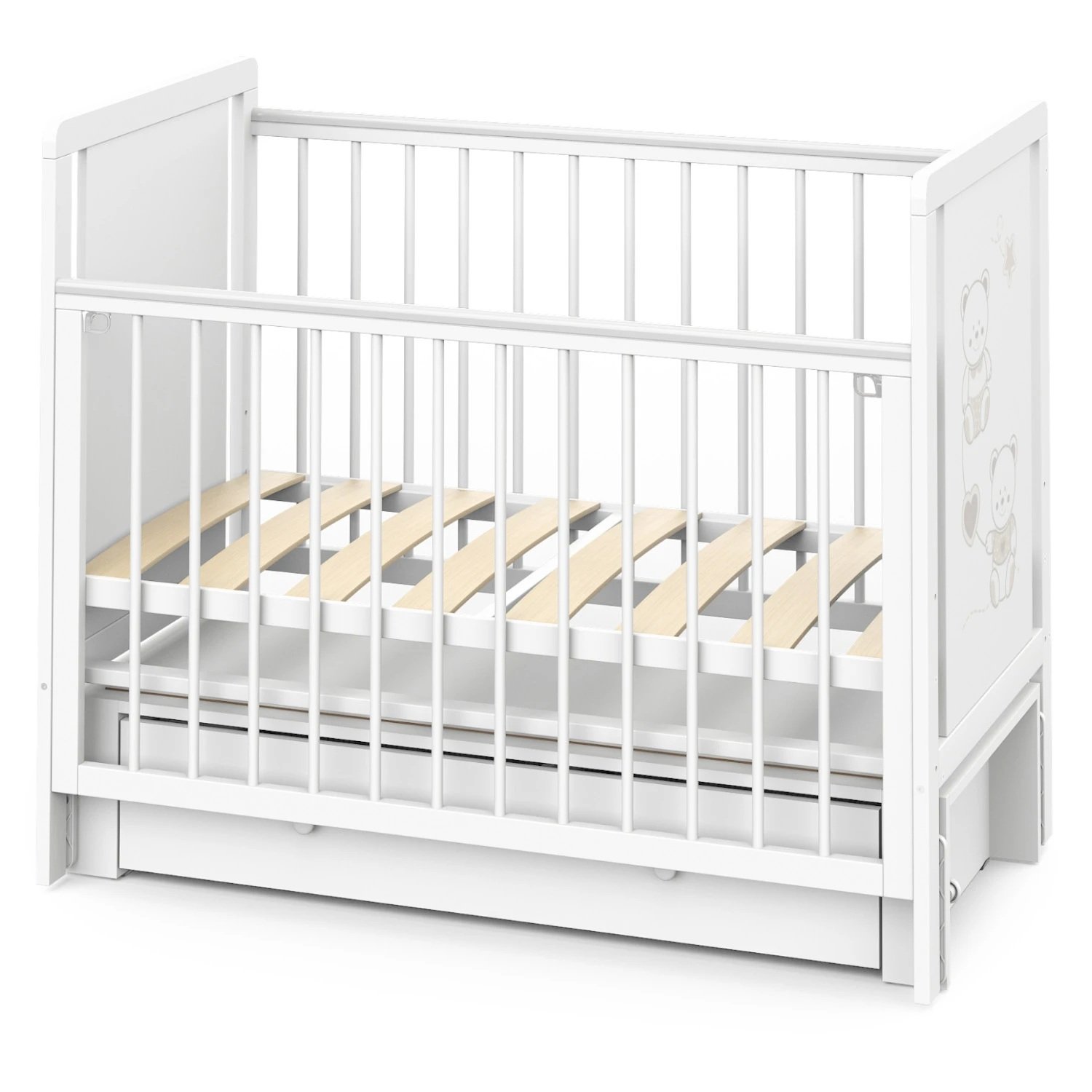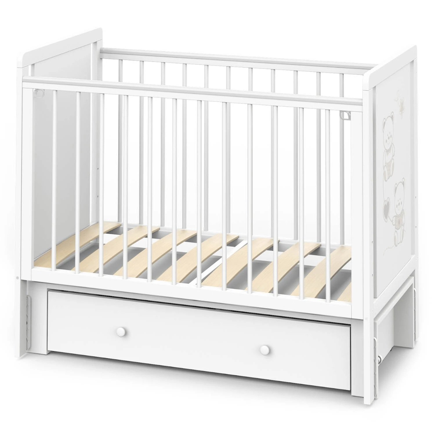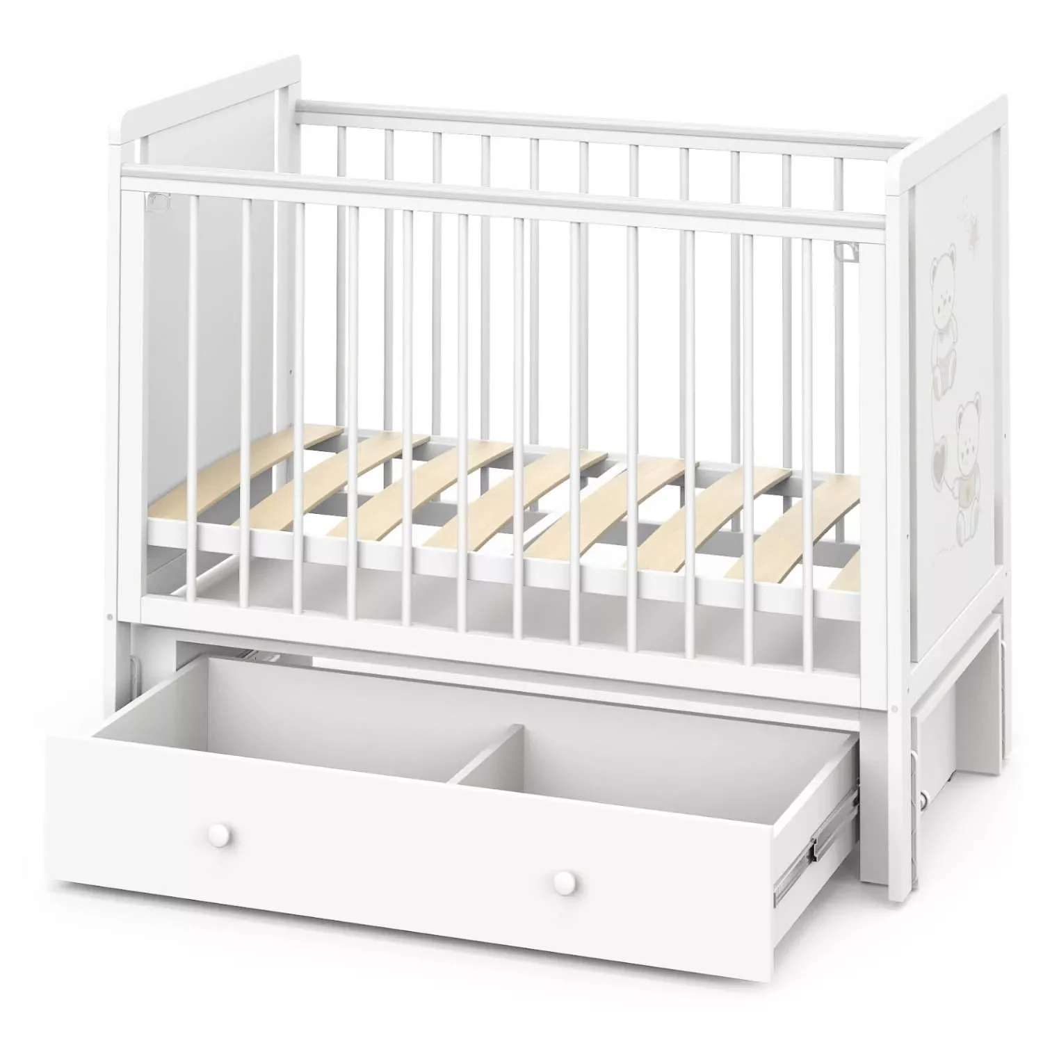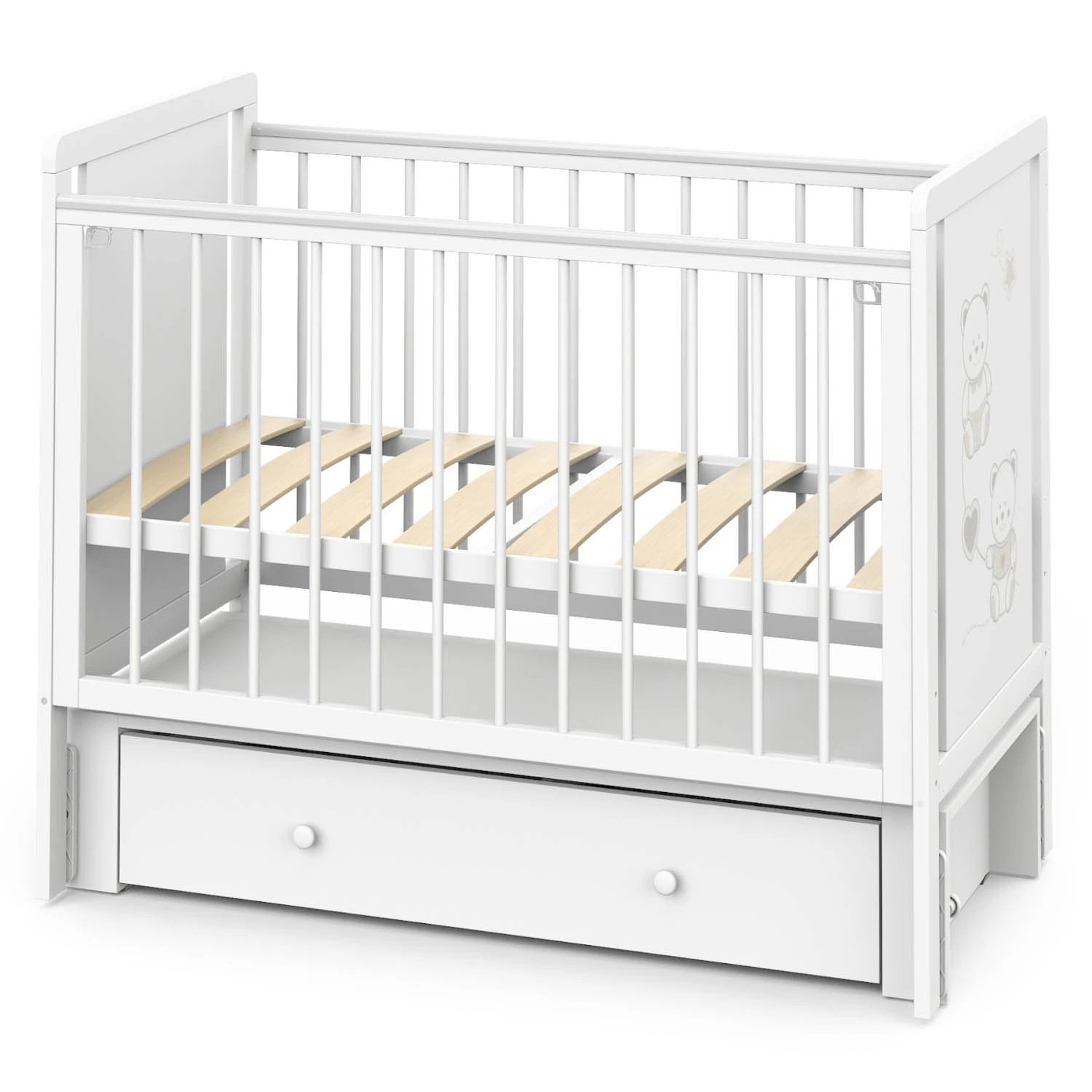 Кроватка Indigo "Happy Friends" с маятником, колёсами и ящиком — идеальное решение для тех, кто ищет практичную и привлекательную модель для ассортимента магазина. Конструкция выполнена из массива берёзы и ЛДСП, оформлена в светлом цвете "белая аляска" с милым рисунком мишек. Маятниковый механизм обеспечивает плавное качание, а комплект колёс добавляет мобильности. Вместительный ящик на шариковых направляющих позволяет хранить постельные принадлежности, игрушки и другие нужные вещи.