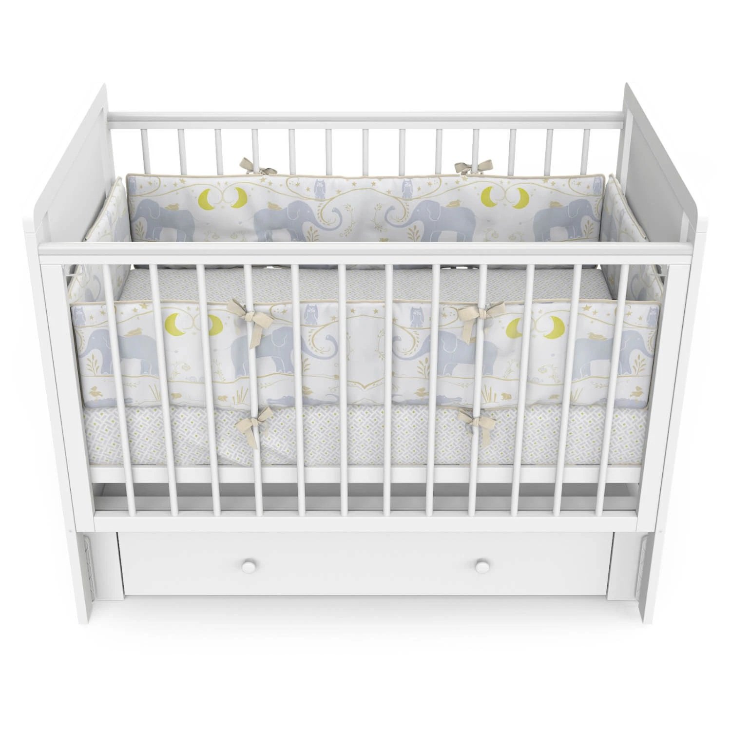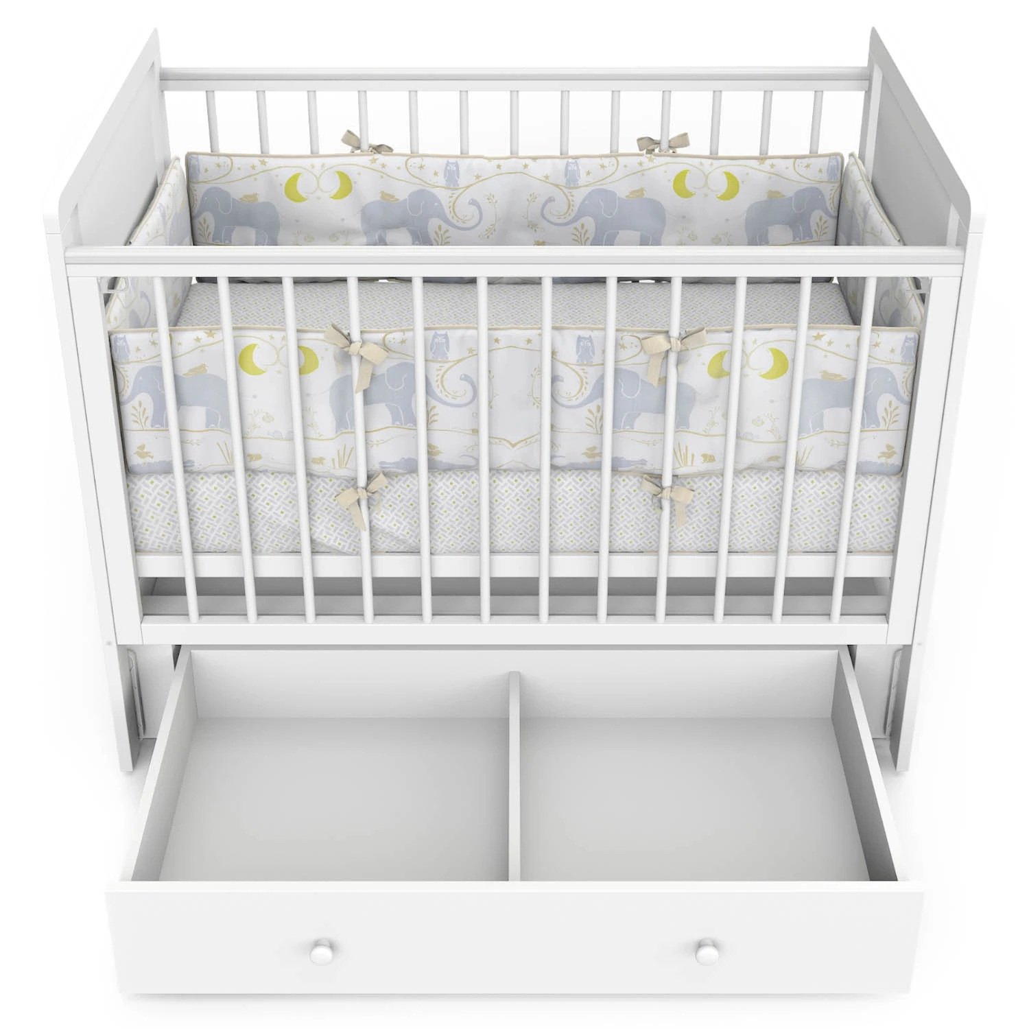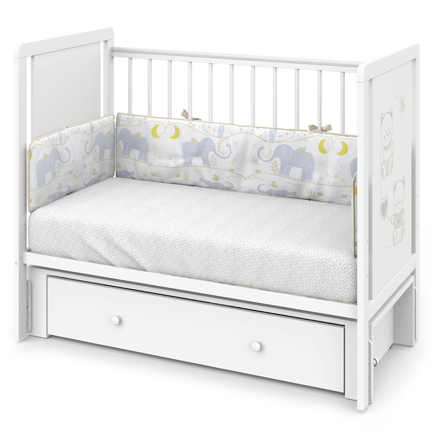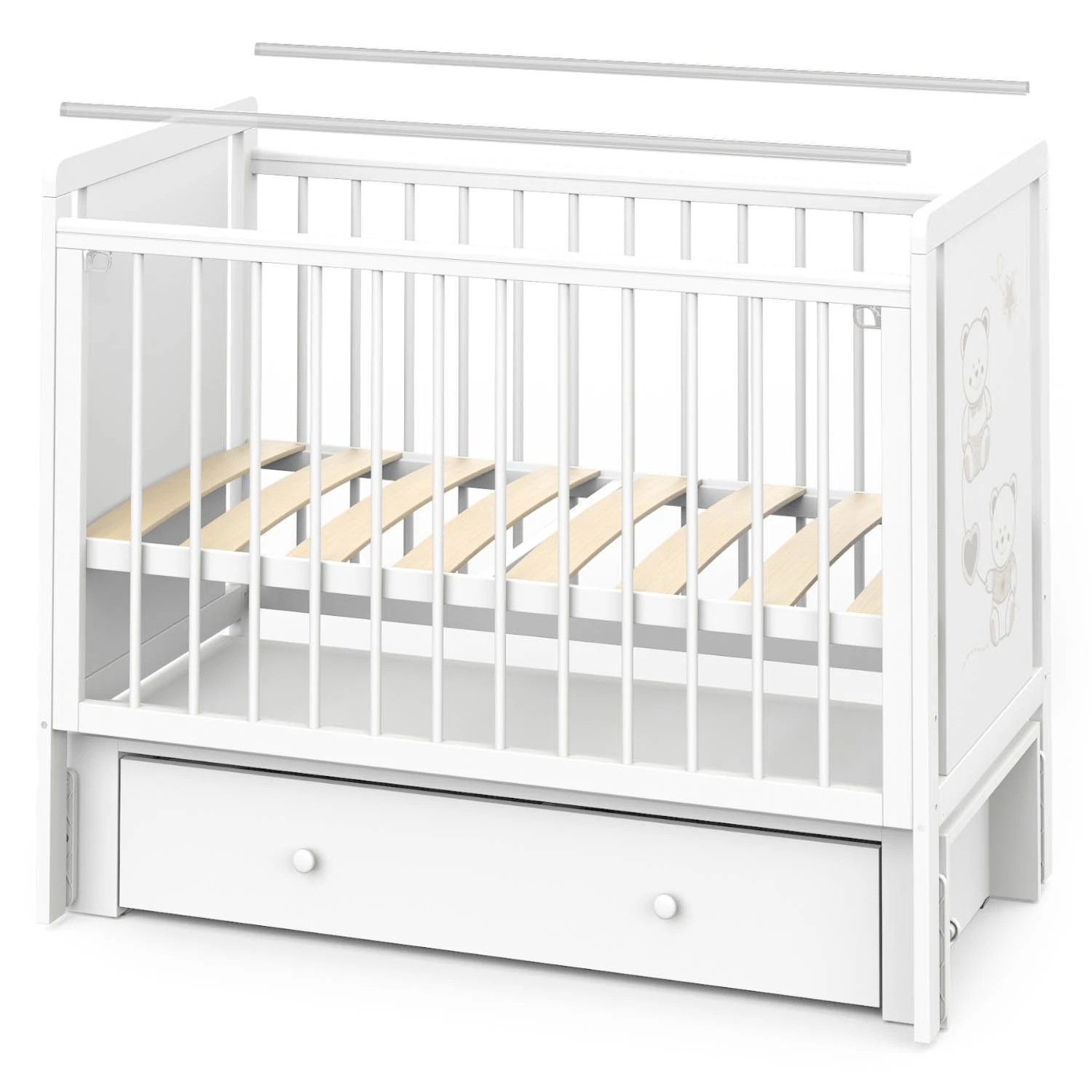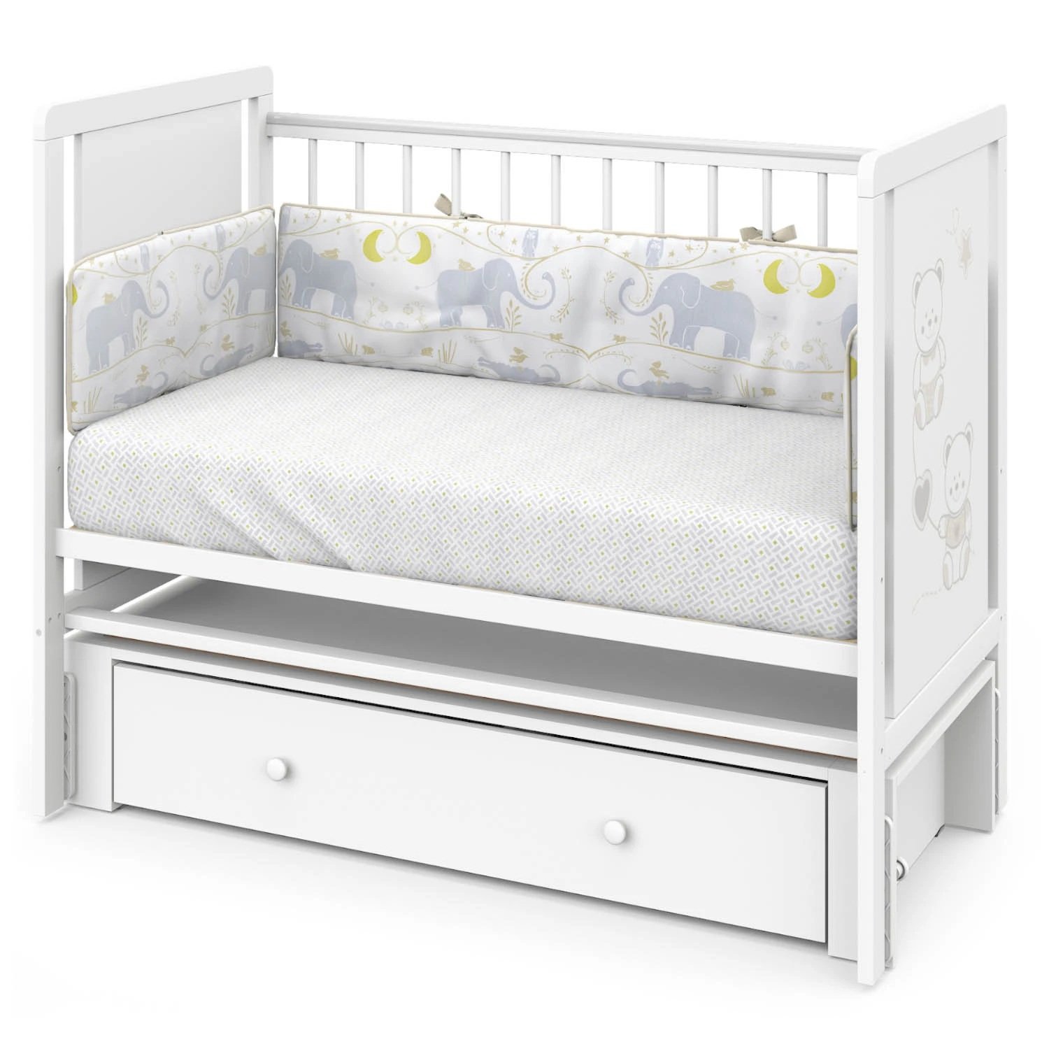 Кроватка Indigo "Happy Friends" с маятником, колёсами и ящиком — идеальное решение для тех, кто ищет практичную и привлекательную модель для ассортимента магазина. Конструкция выполнена из массива берёзы и ЛДСП, оформлена в светлом цвете "белая аляска" с милым рисунком мишек. Маятниковый механизм обеспечивает плавное качание, а комплект колёс добавляет мобильности. Вместительный ящик на шариковых направляющих позволяет хранить постельные принадлежности, игрушки и другие нужные вещи.